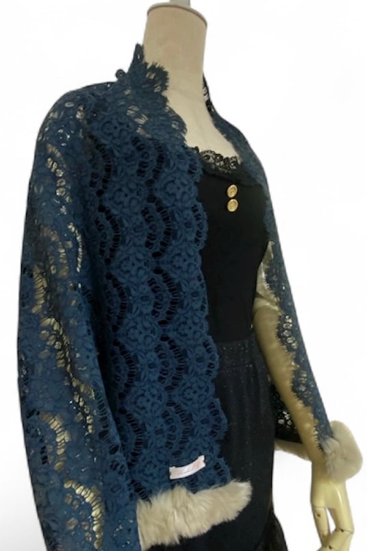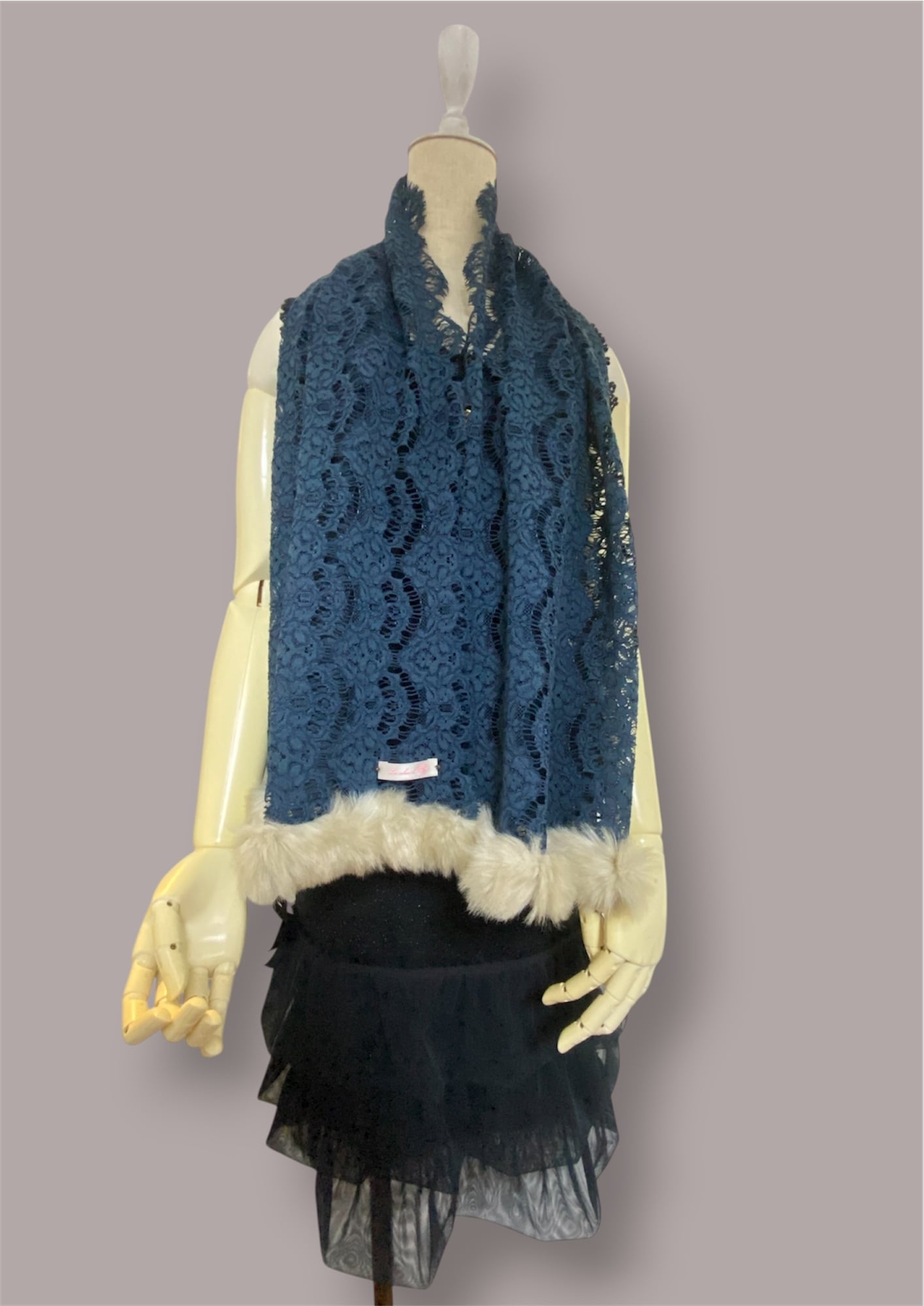 美しいコードレースが深いブルーグリーンに染め上げられたレトロでいて華麗なストール
