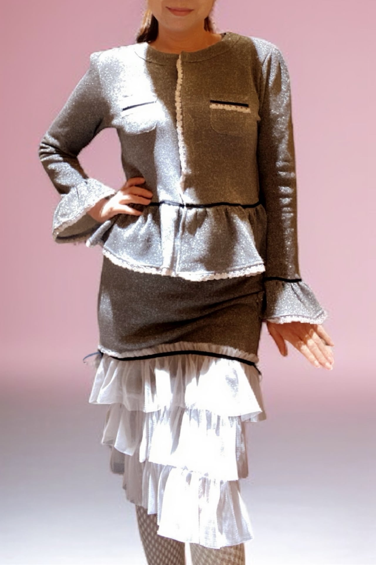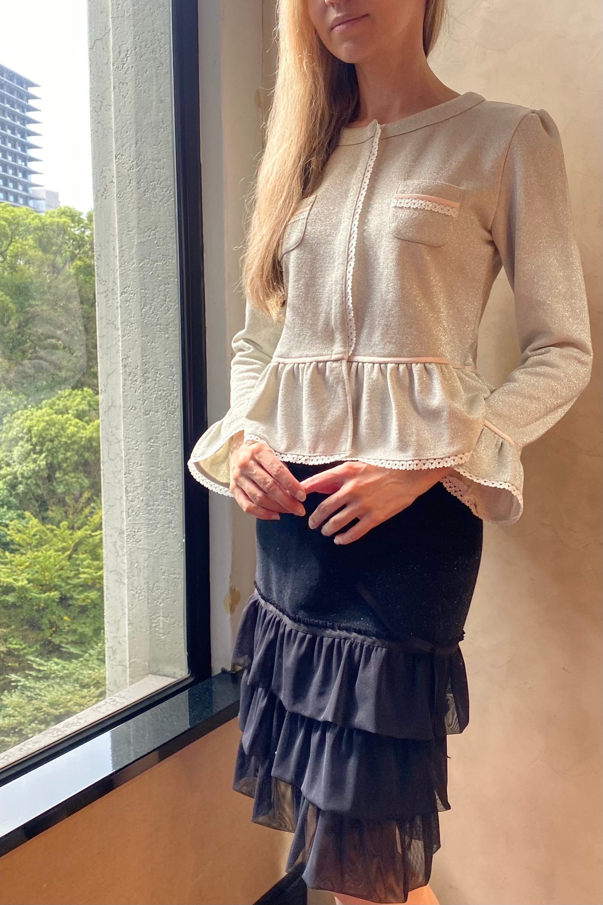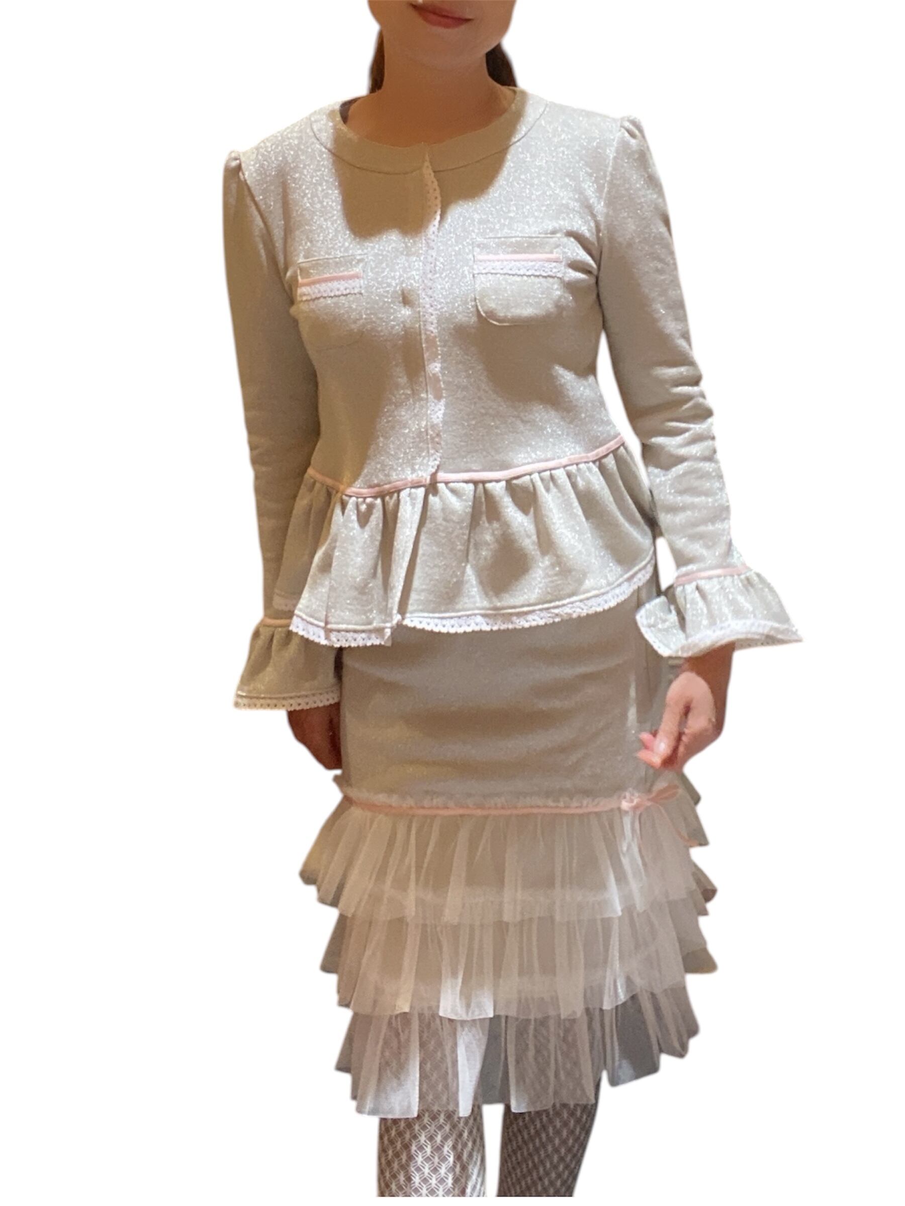 同素材のスカートと合わせて 華やかなスーティングもオススメです。