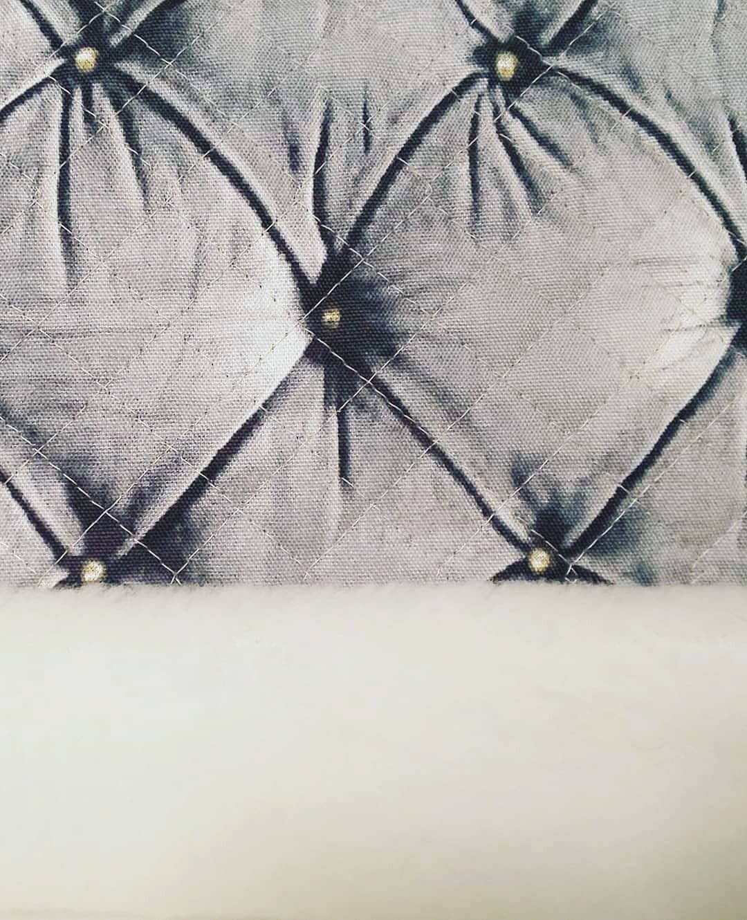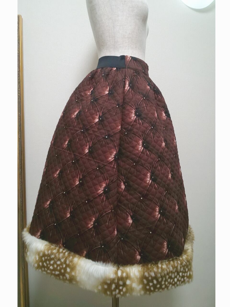 鋲打ちレザーのファブリックプリントがオシャレ✨ トロンプルイユの質感が重厚だけど 本当はコットン系のあったかキルティングの優しい膝下スカートです♡