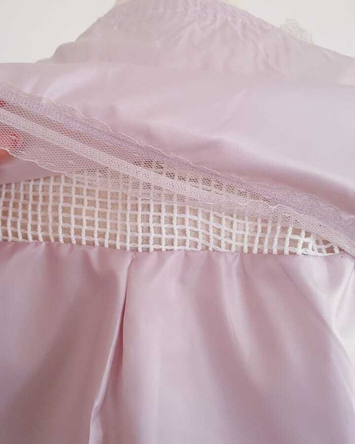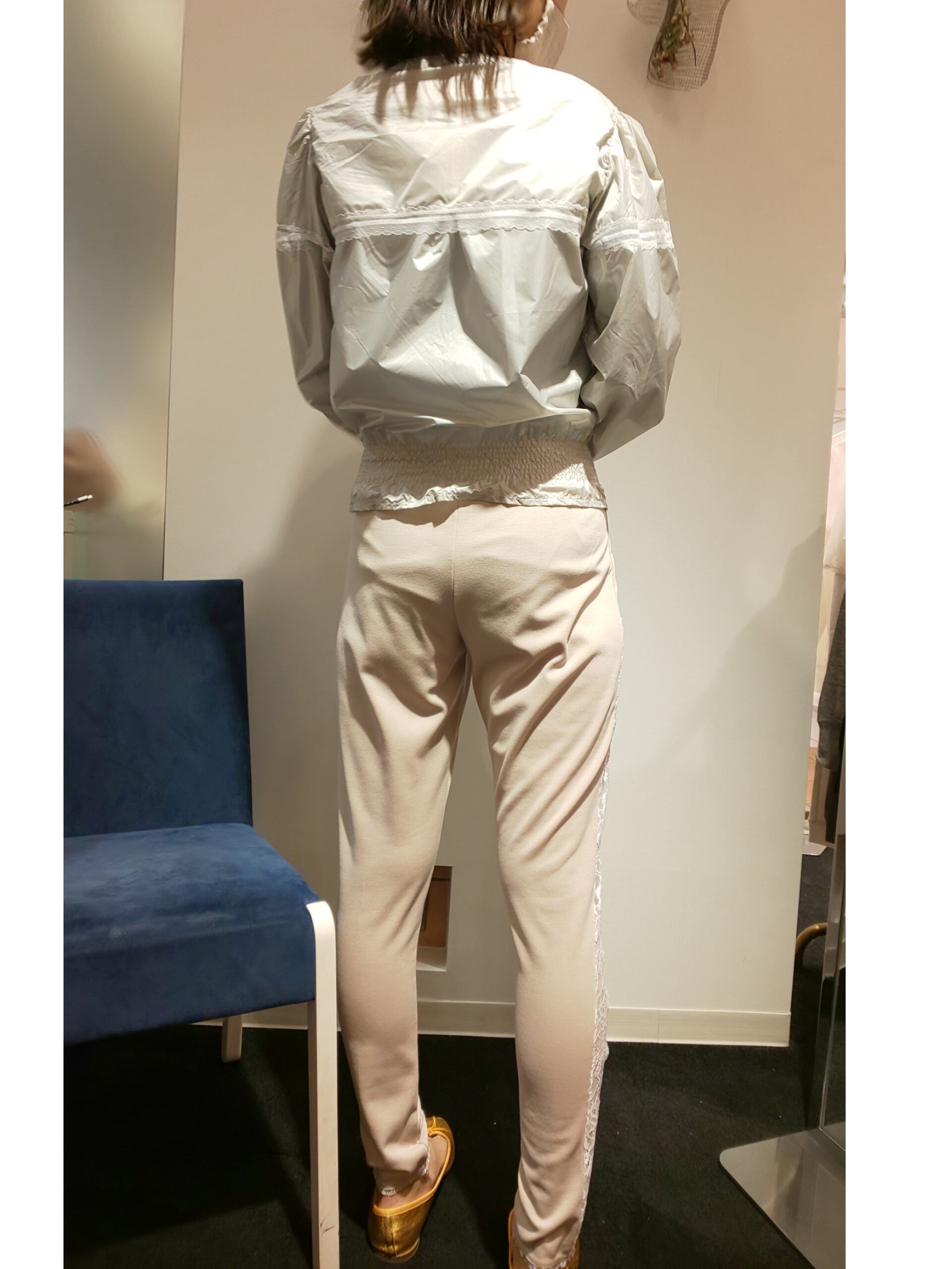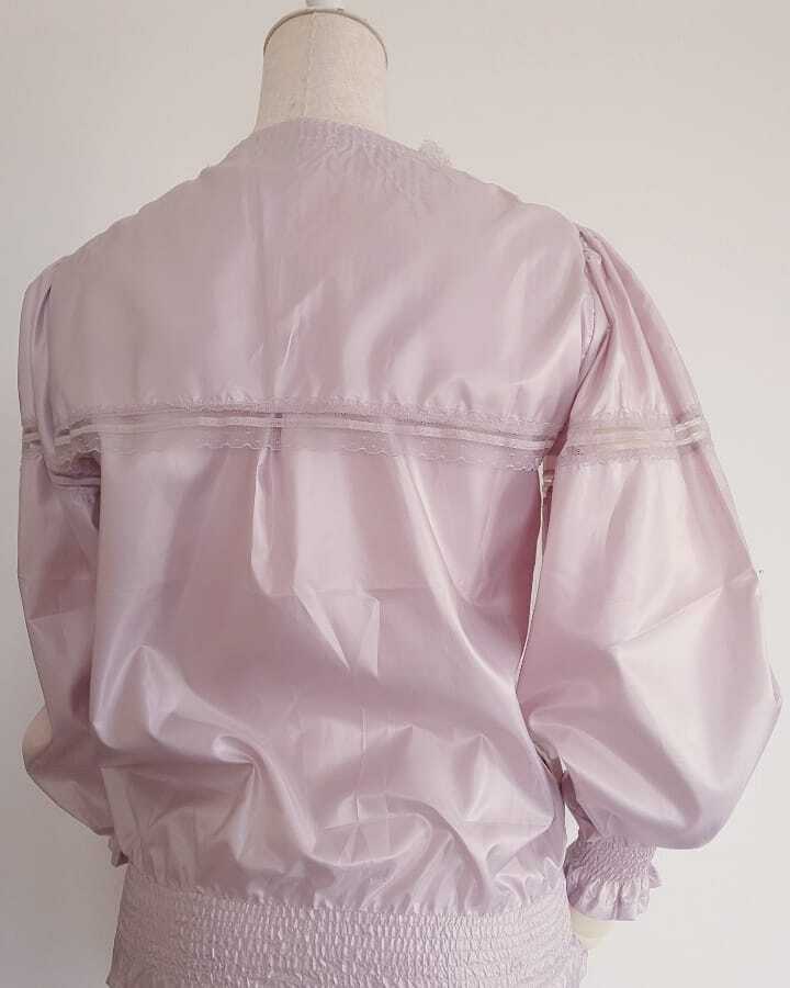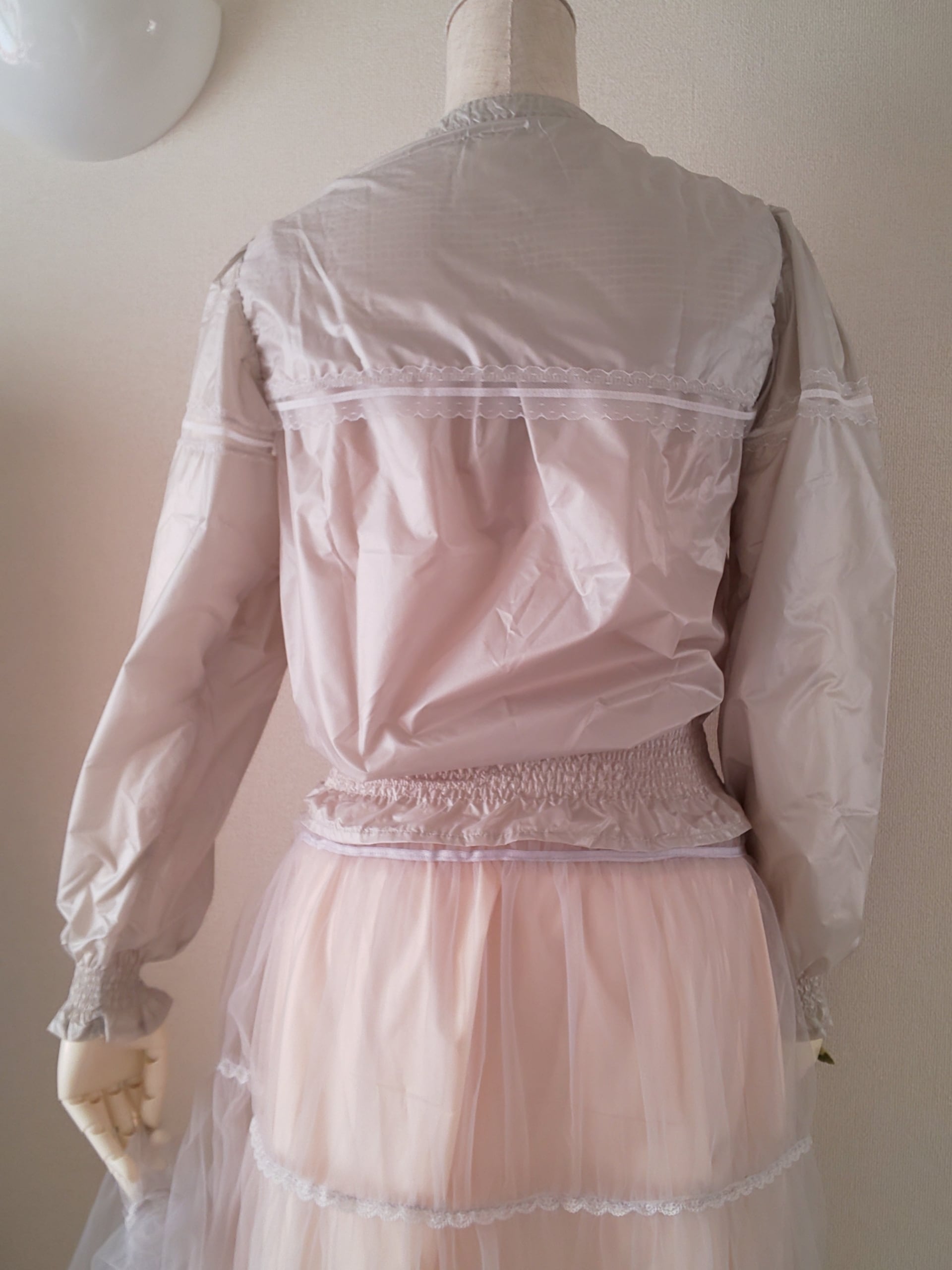 袖幅をたっぷり採ったパフスリーブ、軽いムードを演出する優しいレースをそこここに配してフェミニンさも忘れない