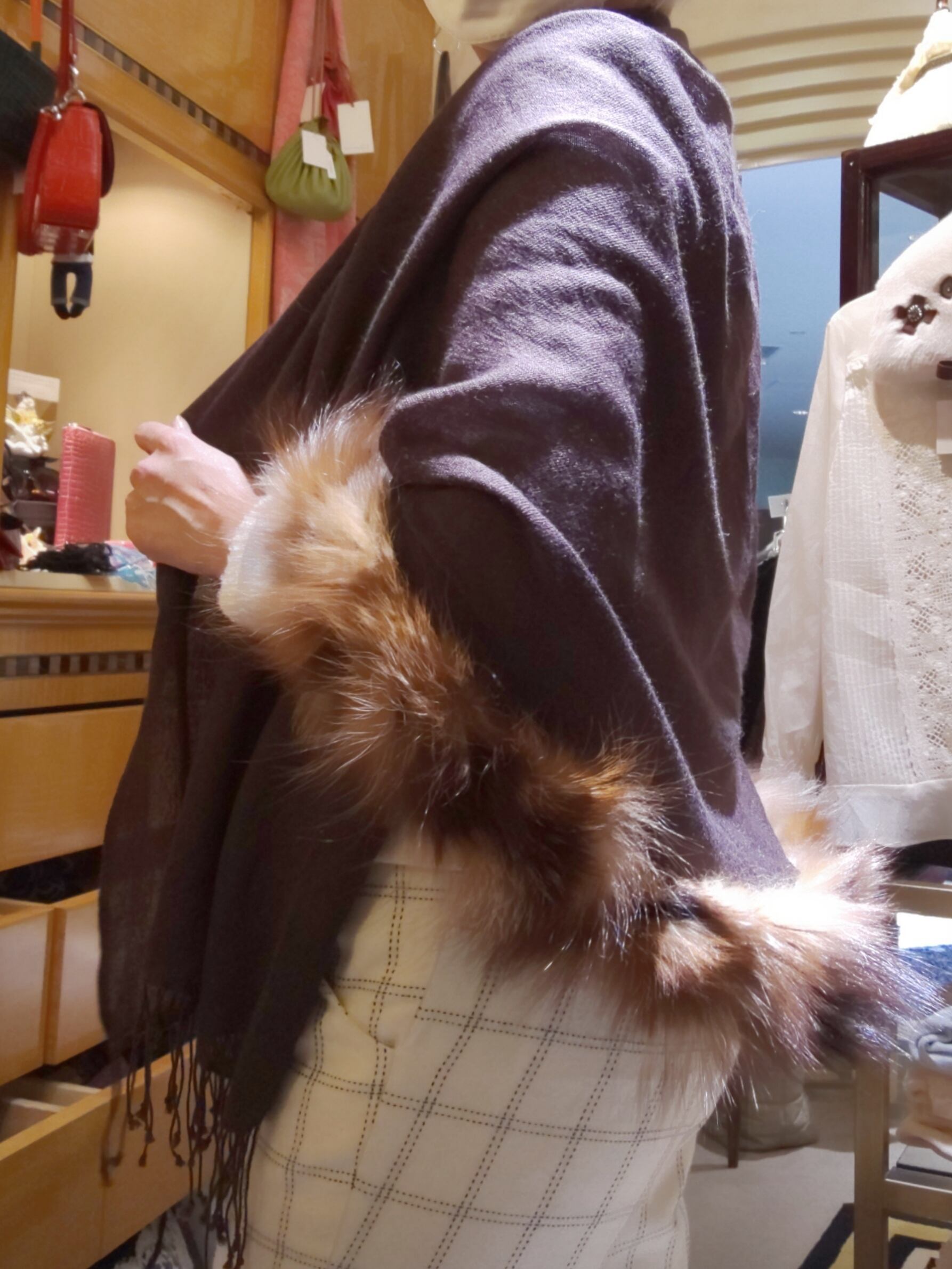 ファーの風合いも優しく 襟元に沿わせても ケープの様に裾側に落としても とってもオシャレ